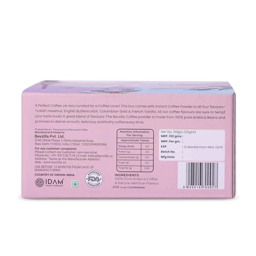 Specification: Bevzilla 25 Grams X 4 Instant Coffee Powder Pack of Colombian Gold, Turkish Hazelnut, French Vanilla & English Butterscotch | Premium Arabica Instant Coffee| Strong Coffee