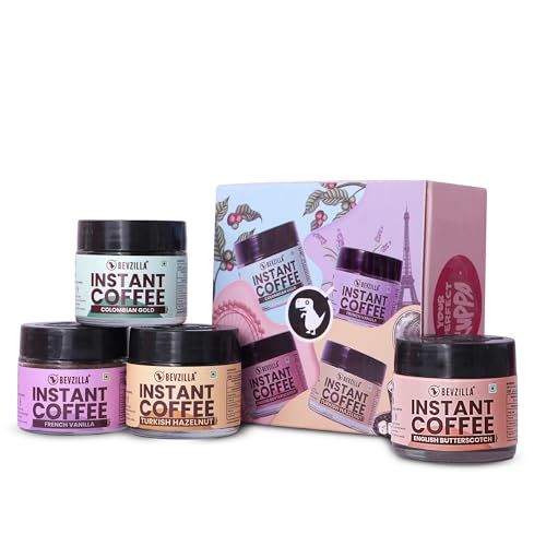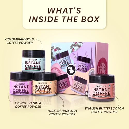 Bevzilla 25 Grams X 4 Instant Coffee Powder Pack of Colombian Gold, Turkish Hazelnut, French Vanilla & English Butterscotch | Premium Arabica Instant Coffee| Strong Coffee