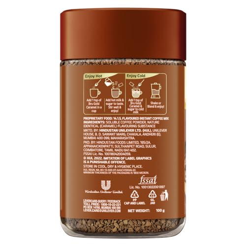 Specification: Bru Gold Caramel 100gram | Flavoured Instant Coffee | Flavourful Twist to Your Everyday Coffee | Made with Freeze-Dried Coffee | Makes 80 cups |Powder|Bottle